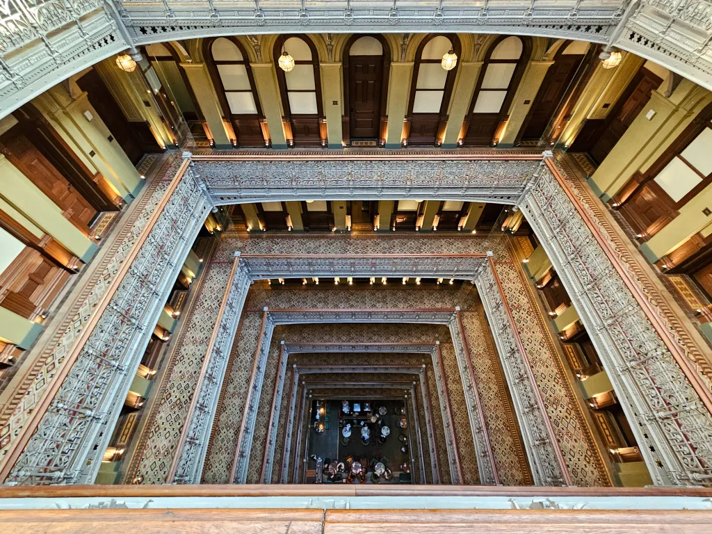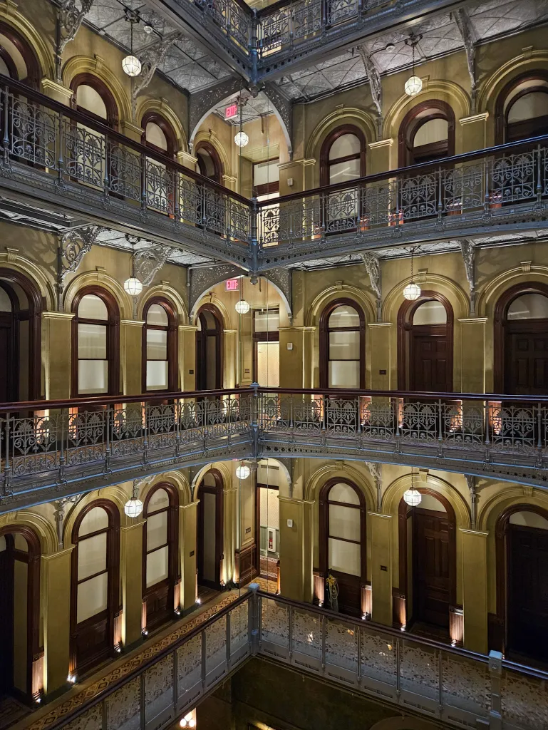 One of the most remarkable features of the building is its nine-story central atrium, topped by a pyramidal skylight and surrounded by ornate cast-iron balustrades. When I first saw it running through the hotel, it definitely took my breath away.
